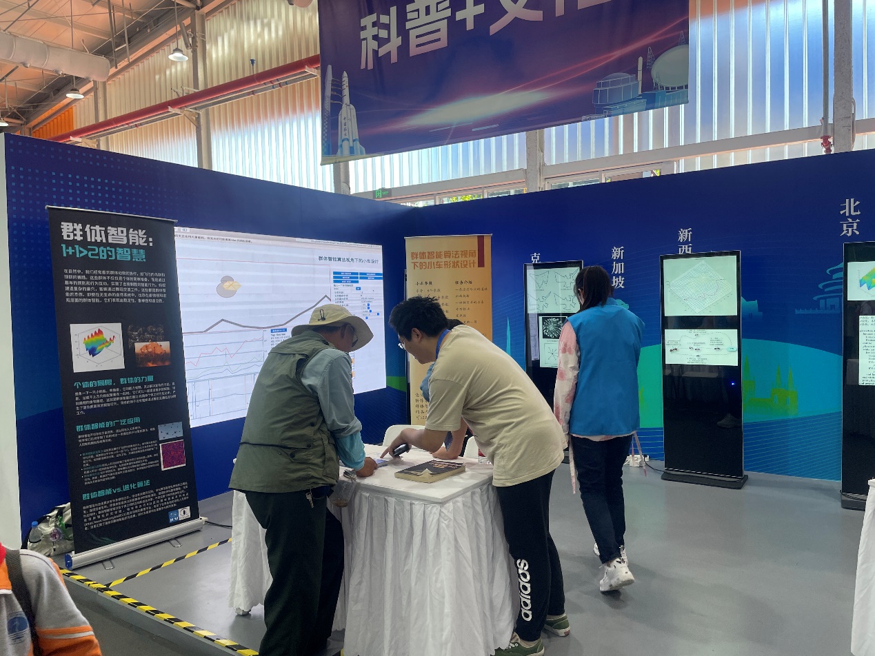 群体智能设计小车项目同样吸引了一群小学生。他们聚精会神观察着烟花算法迭代产生不同形状的小车,每次尝试都伴随着笑声和欢呼声。成年观众也对小车的自动化设计十分感兴趣。计算智能实验室的成员耐心解释了设计背后的科学原理,赢得了观众的赞誉和认可。