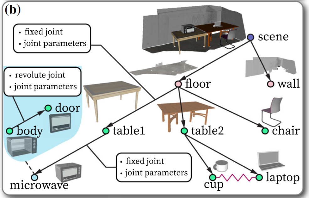 这项工作提出利用一种特殊的场景图作为连接场景重建与机器人交互的桥梁,在帮助重建出符合物理常识的虚拟场景的同时,为机器人自主规划提供必要的信息。一方面,这一场景图将场景中感知到的物体、房间结构以及它们之间的关系组织起来,如图3(a) 所示。它的每个节点代表识别并重建出的真实场景中的物体或者房间结构,包括了它的几何(例如重建出的三维网格(mesh)、三维最小包围盒、提取出的平面特征等)与语义信息(如实例与语义标签);而每条边则表示节点之间的支撑关系【见图3 (a) 中的有向边】或者紧邻关系【图3 (a)中的无向边】,代表着某些物理约束信息。比如对支撑关系来说,父节点需要包含水平的支撑面来实现对子节点的稳定支撑;再如对紧邻关系来说,相互接近的两个节点的三维几何不应该有相互的重叠等。另一方面,根据语义与几何的形似性并综合考虑节点间的约束,图3 (a) 中的节点被替换成几何完整的、可交互的CAD模型【包括多关节(articulated)的CAD模型】,进而得生成可用于机器人仿真交互的虚拟场景,如图3 (b)。这样的虚拟场景在感知能力允许的范围内尽可能保留了真实场景的功能(functionality),也就是潜在动作信息,可以有效实现对现实场景中与物体交互结果的仿真。而相应地,得到的场景图表征也包含了对环境运动学以及约束状态的完整描述,可用来预测机器人动作对运动学状态的短期定量影响并帮助机器人运动规划,以及估计机器人动作对约束关系造成的长期定性影响并支持机器人任务规划。