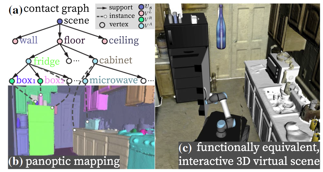 在这篇论文[1]中,研究人员提出了一个全新的研究问题:重建与现实场景功能相同的(functionally-equivalent)、可交互的(interactive)虚拟场景,以保留原场景的潜在动作信息。重建后的虚拟场景可以被用于机器人自主规划的仿真训练与测试。为实现这一重建任务,研究人员提出了一种基于物理支撑(supporting relation)与紧邻(proximal relation)关系的场景图表征,如图2(a);它的每个节点代表场景中的一个物体或者一种房间结构(墙/地面/房顶)。这一场景图表征将重建后的场景以及其中包含的物理约束有机组织起来,以保证得到的虚拟场景是符合物理常识的。同时,它可以直接被转换成环境的树状运动链(kinematic tree),完整地描述了环境的运动学关系状态,并支持前向预测机器人动作对环境的影响,可被直接用于机器人规划任务中。这篇论文也提出了一个完整的机器视觉系统来实现这一重建任务,并为重建后的场景设计了输出接口,使其能够被无缝接入机器人仿真器(例如Gazebo)和VR环境中。这一论文的部分前期工作[2]曾发表在ICRA 2021上。