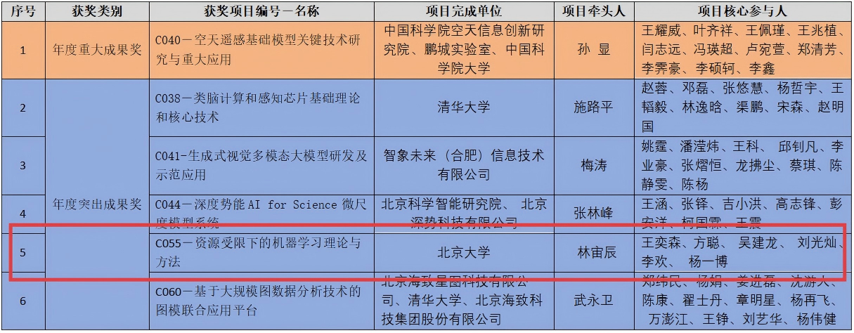 林宙辰教授为第一完成人的获奖成果为“资源受限下的机器学习理论与方法”,其他完成人包括王奕森、方聪、 吴建龙、 刘光灿、李欢、杨一博,后五位均为林宙辰教授指导或联合指导的原博士生。