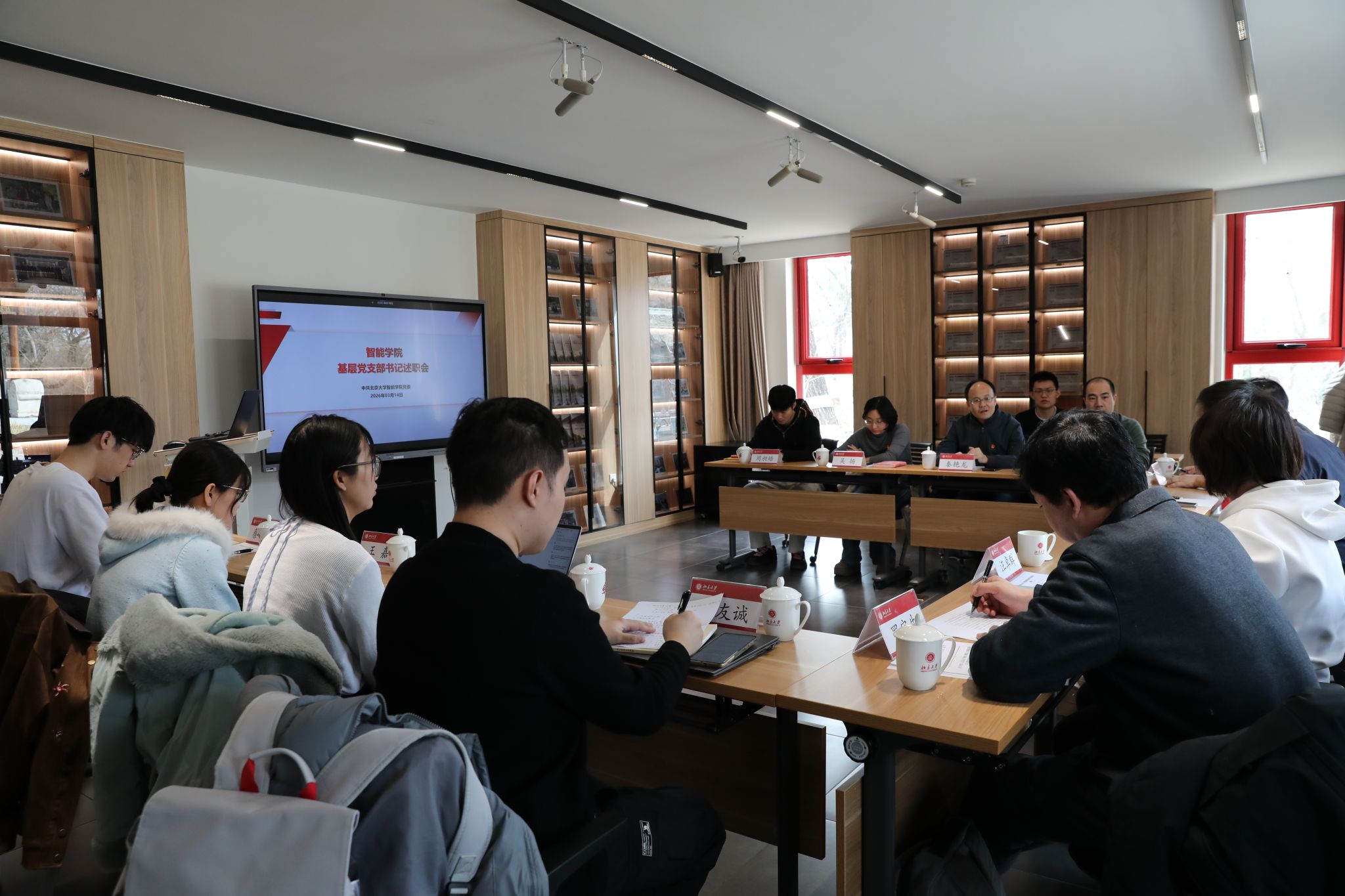 高年级博士生党支部书记蔡少斐作汇报。他介绍,支部成员均为高年级博士生。支部以“打牢理论基础、规范组织生活”为主线,结合博士生科研痛点组织“从科技自立自强看科研选题”等研讨会,全年活动出勤率保持在90%以上。针对理论学习形式单一、线下活动不足等问题,支部计划加强跨实验室的团队建设,并将时政热点与AI前沿研究深度结合。