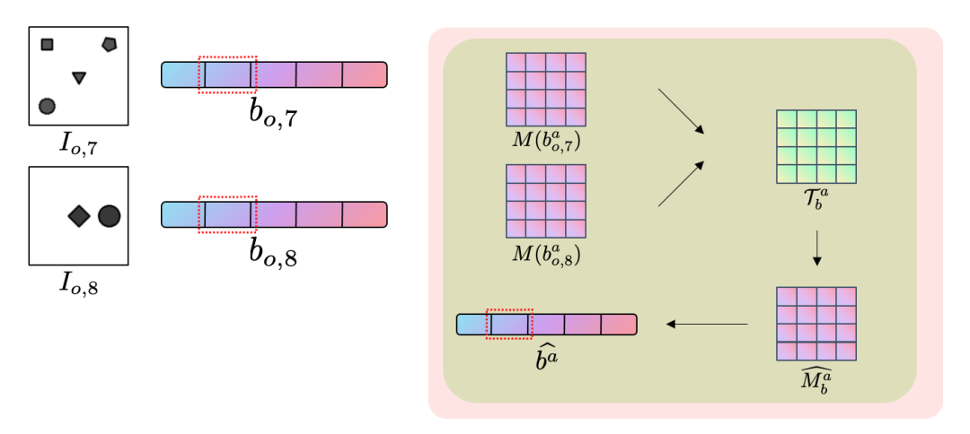 随后的符号过程使用代数理论去解答隐藏的关系。首先,符号系统利用皮亚诺公理将对单张图片的理解转化为高阶矩阵空间中的点。这些高维空间的点有助于我们将原本离散的代数运算符转化为矩阵空间中的变换。我们利用表示理论和代数系统的封闭性,将解析代数运算的问题转变为代数系统上的优化问题。选取最简单的线性优化问题来建模代数关系,不仅有解析解,且具有良好的可解释性。我们用每个题目中的题干部分分析隐藏关系,然后将分析所得的隐藏关系作用到题干中的缺失部分以预测可能的结果,再将预测的结果与选项做比较,获得最终的答案。由于我们的代数推理系统并不依赖于每个具体的运算符,而是可以在推理的过程中归纳新的运算符,因此我们称我们的方法是半符号的