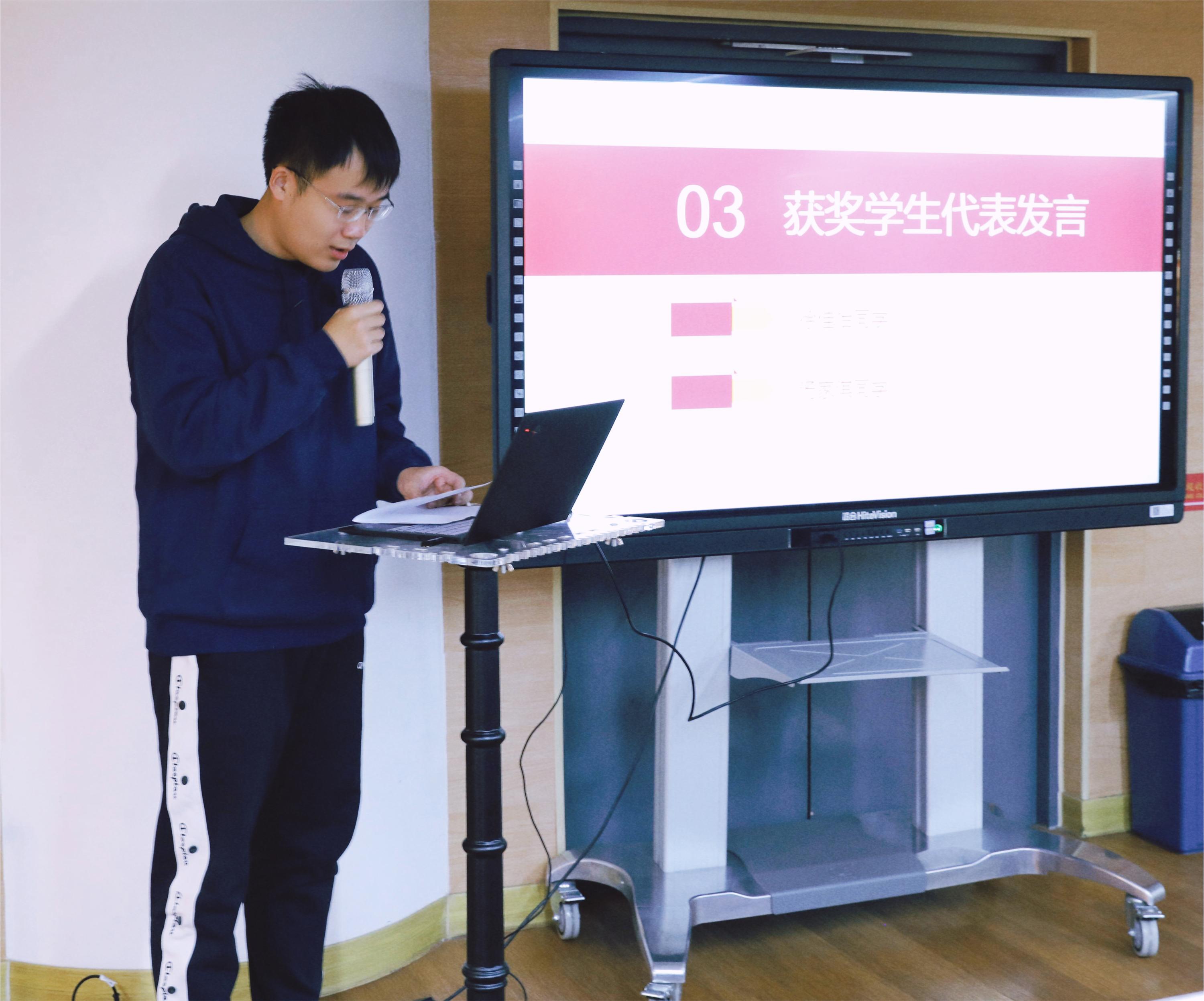 汤家淇同学深情回忆了一路走来的点点滴滴。在他的眼中,老师们人格迥异,各有风度,兢兢业业,平易近人;同学们风采动人,或担当班务,或讨论学术,或建言献策,班风严整活泼。他说,成长中难免暂时落后,差距并不可悲。不必妄自菲薄,要在科学借鉴、刻苦训练、不断钻研、主动求助的日常里找寻适合自己的节奏,稳步走好每一段路。他衷心感谢捐赠企业的热心关怀,表示将继续刻苦学习,健全人格,砥砺前行。